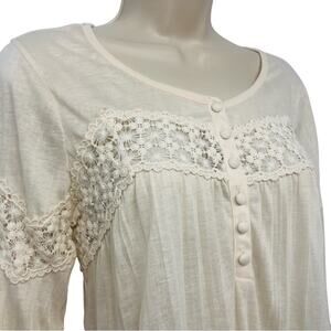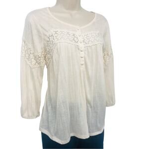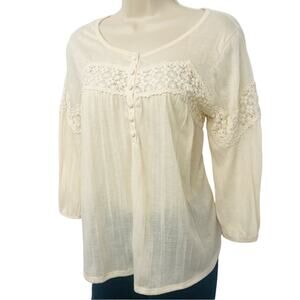 Cream Crochet Trim Henley Style Pop Over Top Scoop Neck Button Trim Loose fit