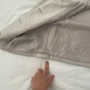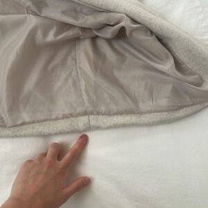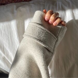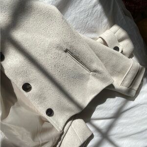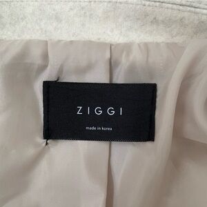 Cozy and stylish cream colored jacket with front pockets and three buttons. Fabric is soft and almost flannel-like, and has a marled, cream-gray heathered look. Features a collar, adjustable sleeve straps, and smooth inner lining fabric. From Korea - tag says the brand is "Ziggi".