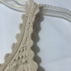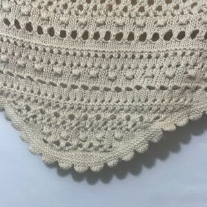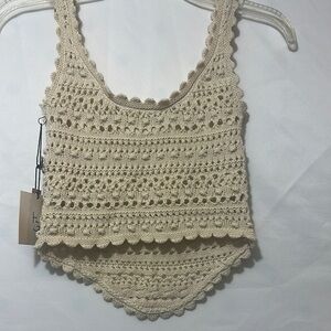 This cream tank top features a sleeveless design with a chic cropped cut, adorned with intricate embellishments for a stylish touch. Its unique texture and elegant details make it a standout piece for any casual outing or summer event.