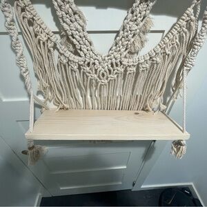 This cream display shelf features a stunning macramé wall decor that showcases a combination of intricate knotting techniques. The piece is suspended from a natural wooden dowel, creating a soft and textured appearance that enhances any wall. Its bohemian style adds a unique touch to your home decor.