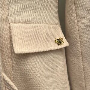 Elegant cream coat with double-breasted design and ruffle hem. Features black buttons for contrast. There is a small mark on the back of the collar, as pictured.
