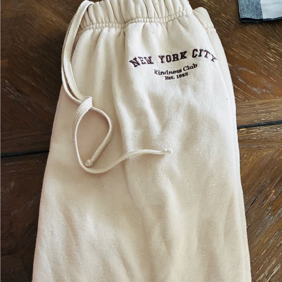 Soft cream drawstring sweatpants. Cozy fabric with subtle texture. Simple, versatile style for casual wear.