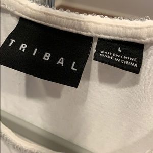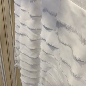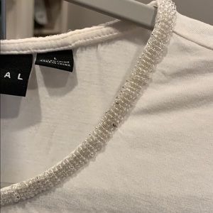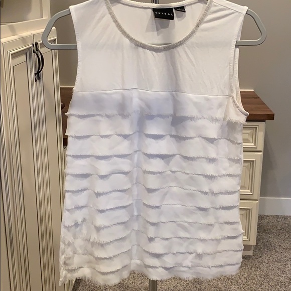 Cute sleeveless top to dress up or down. Embellished neck with small beads and frayed ruffles across front—flattering fit. Great alone or with jeans/skirt/slacks!