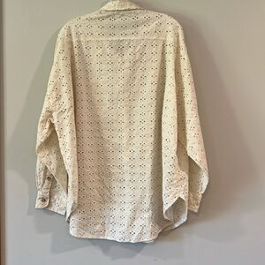 Stylish cream eyelet button-up shirt with long sleeves and a front pocket. Perfect for casual wear, beach, vacation, cruise, cover up. I’d guess a xl or xxl.