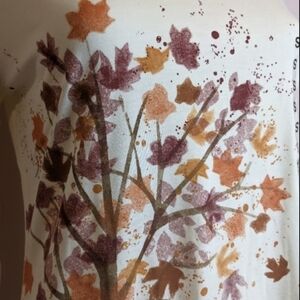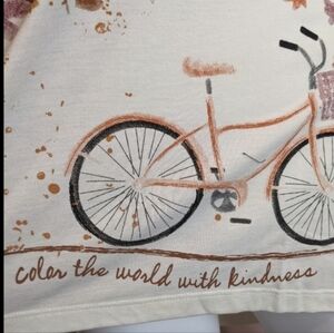 Crafted from super-soft fabric for maximum comfort, it features a classic scoop neck, cream base with a fall leaves and bicycle print design for a chic seasonal look.