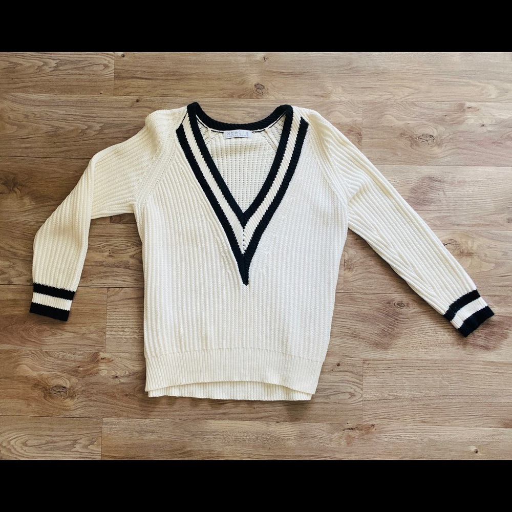 Thick, very warm and cozy knit cream fall sweater. Has black detailing around low v cut neckline and sleeves. Is long enough to be worn oversized with leggings or slightly tucked into pants. Very good quality and condition, only worn a handful or times.