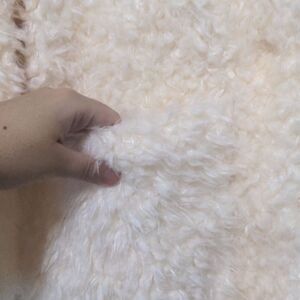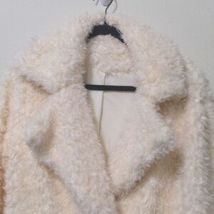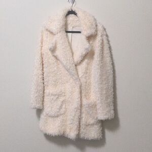 This preloved Cream Faux Fur Coat has a vintage Bratz vibe. The coat is a mid length coast just below the waist with snap button closure and front pockets.
