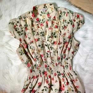 This Cream Floral Top has high neck line with a slight dip in the front. This top is a babydoll fit so it fitted under the bust. This top has a cute floral, sheer pattern fabric. It also features some scalloped lace on the top. Plus the top has a fitted cap sleeve.
