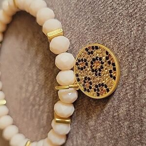 Cream Glass Beaded Leopard Print Charm Stretch Mobwife Bracelet