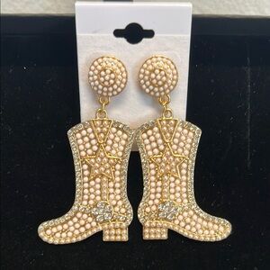 Add a touch of sassy western flair to your outfit with these stunning gold and cream boot earrings. Perfect for the country concert season 🎶🤠