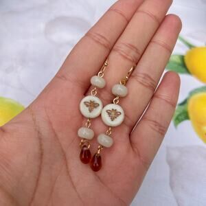 autumn earrings, fall earrings, long earrings, neutral earrings, daily wear earrings, winter earrings, bee earrings, brown earrings, honey earrings, cream earrings, white earrings, beige earrings honeycomb earrings, sweet earrings, bug earrings, camping earrings, whimsical, bee charm, cool earrings, statement, y2k, cute, holiday gift, Christmas gift, beaded, novelty, anniversary gift, birthday gift