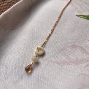 Gold necklace features a woodsy auburn brown Czech glass teardrop and a cream beige bee and jade bead. Chain is adjustable 15-18". Also available as a set.