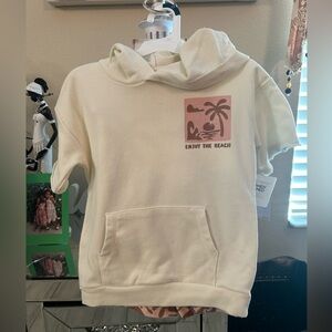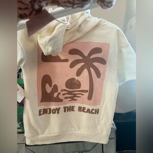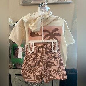 Cream hoodie featuring a beach graphic with palm trees and sunset. Short sleeves and front pocket, short pants.