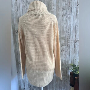 Knit sweater in a wrap around style and cowl neck. Wooden button details. New with tags. Size small. This is so cute paired with leggings or skinny jeans since it is loose and a bit oversized.