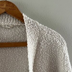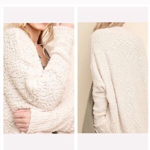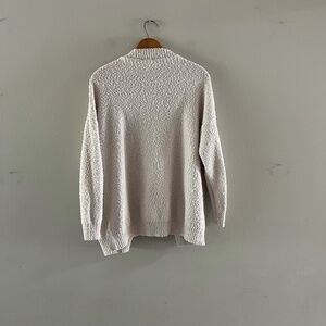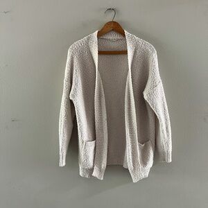 Chic and comfortable, this neutral cream cardigan features dobby/popcorn knit with two front pockets. Size M/L with approximate measurements laying flat of 21" chest and 26"length. in excellent used condition from a smoke-free, dog friendly home.