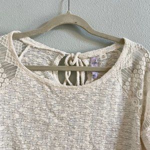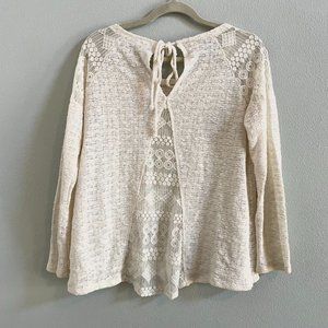 Cream long-sleeve sweater with lace detail at shoulders and back. A-line fit with a tie-back closure.