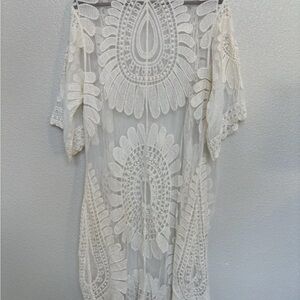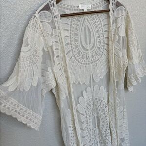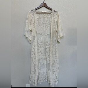 Elegant cream lace kimono cardigan with intricate floral patterns. Perfect for layering.