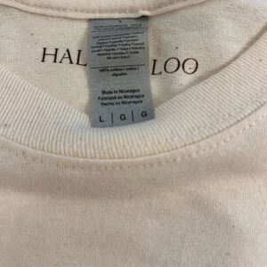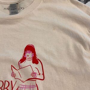 Cream long sleeve tee featuring a red graphic and text design. Comfortable and stylish for casual wear.