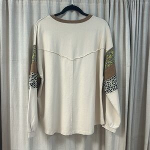 Cream sweatshirt with colorful 'Love' graphic. Features pink, green, and brown accents with leopard print details.