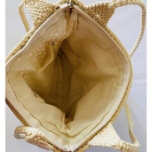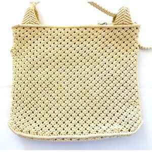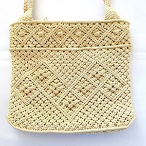 Chic and bohemian, this cream macramé crochet shoulder bag features a lined interior for practicality. Measuring 10.5"x 9.5", it’s perfect for everyday use or adding a vintage flair to your outfit. Good vintage condition with a small stain and minor zipper peel (see pictures).