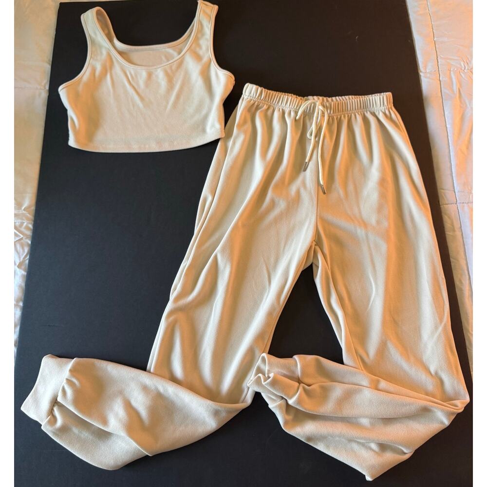 Features/Description: Cream matching set. Top is a cropped tank. Bottom is matching sweat pants. There is no drawstring, that is simply for decoration. Waist is elastic and stretches.