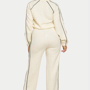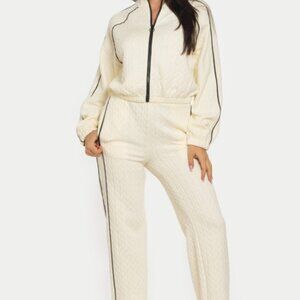 Trendy babes will love this two-piece set in cream. The pants are elastic straight leg with pockets and the jacket has a zip up with contrasting pipping stripe detail. Style the pieces together or maximize as separates.