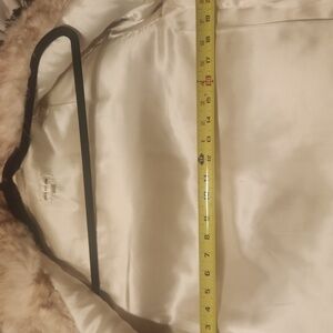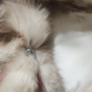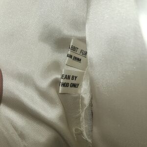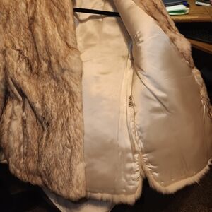 Luxurious vintqge cream multicolor rabbit fur coat with satin fabric lining. Dyed rabbit fur origin in China. Made in Hong Kong brand and size Large. There is one small tear in the seam of lining. Fur is super soft and has pockets. Feels amazing and looks fabulous on. Closes with four metal closures. It fits like a women's Med/Lrg.