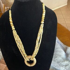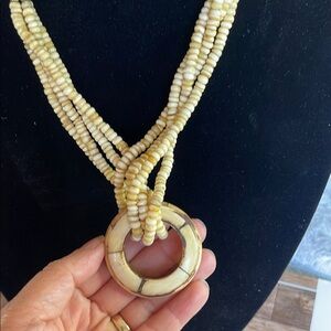 This exquisite cream necklace features a multi-strand design that elegantly converges into a single strand, adorned with a variety of bead sizes and shapes. The piece is highlighted by a circular pendant at the bottom, adding a focal point to its classic charm. Crafted to mimic the look of bone or ivory, it offers a timeless appeal.