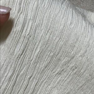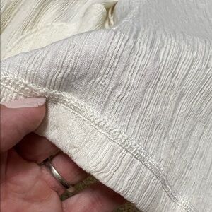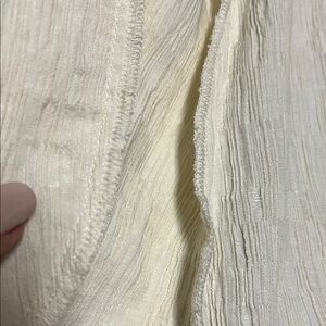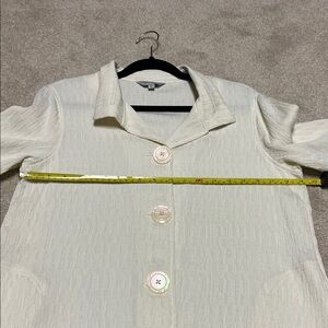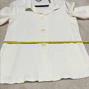 Can be worn as a top or as a jacket. Stylish cream button-up jacket with flared sleeves. Has pockets. Nice layering piece. Flowy. Fabric is structured and is fairly soft with a tiny bit of stretch. Very pretty. Never worn. I can’t find a fabric tag but everything else I have this brand is 100% polyester.