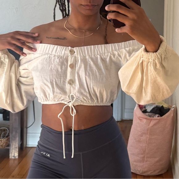 Saboskirt. Size xs but can fit up to a medium comfortably. Elevate your style with this chic cream off-shoulder top. Featuring a buttoned front and drawstring detail, it's perfect for any occasion.