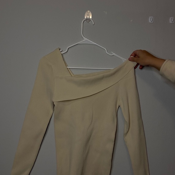 The cutest cream a symmetric neckline. One side covers your shoulder while the other side sits right off of your shoulder. Perfect mix of light weight but warm as well. Fall and spring are the perfect seasons to wear this