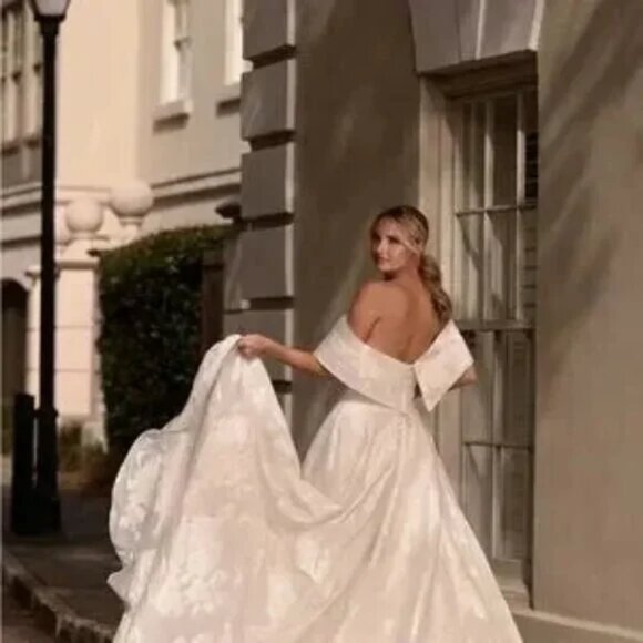This stunning cream gown features an off-the-shoulder neckline and short sleeves, perfect for a bride on her special day. The fitted bodice elegantly accentuates the waist, while the voluminous skirt creates a dramatic silhouette. Crafted from luxurious fabric, it offers a timeless and sophisticated look.