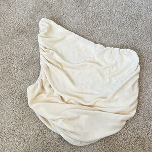 Stylish cream one-shoulder top with draped design. Perfect for a chic look.