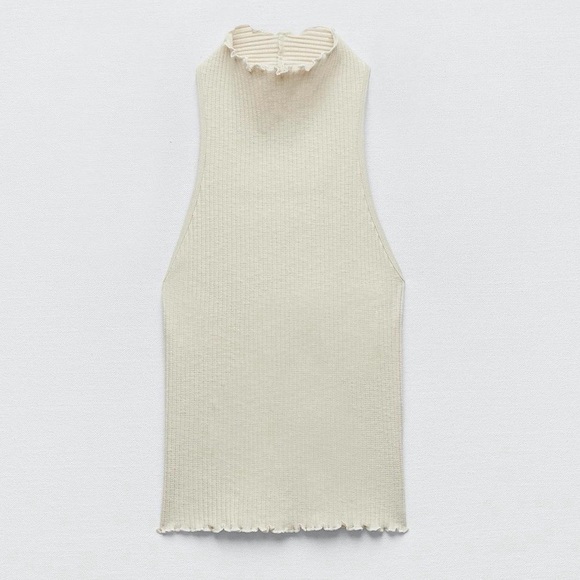 Stylish sleeveless ribbed top in cream. Features a mock neck design and open back. New without tags, never worn