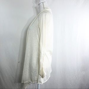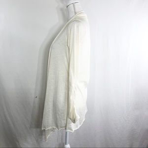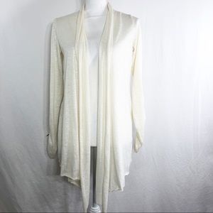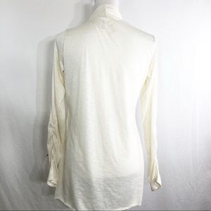 Perfect for those Cold Offices or any other time you need a light jacket. Cream open front. Draped Detail. High Low. Ruching on Sleeves. Good Pre-Loved Condition.