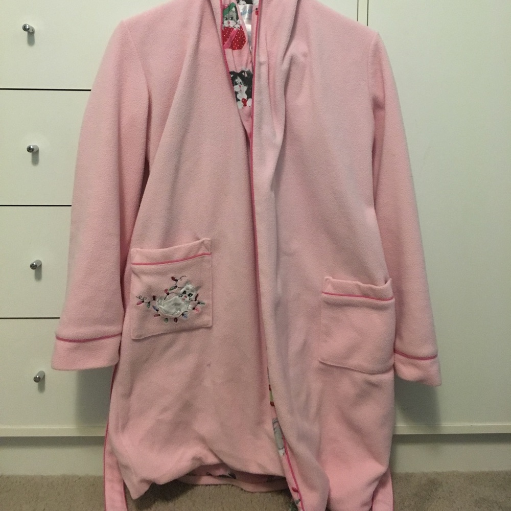 Light pink outside. The whole inside fabric is cats at Christmas 🎄. Two pockets on the front. One has a cat on it and the other is is blank. Two small stains on the front. Barely noticeable. Other than the two stains it is in great condition.