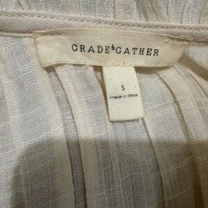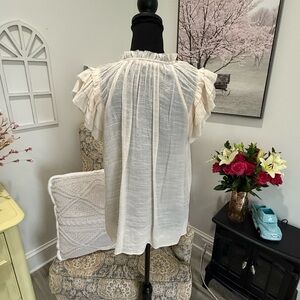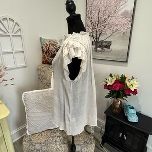 This cream blouse features charming puff sleeves and a stylish ruffled tie front, perfect for a romantic and bohemian look. The cap sleeves and light, textured fabric make it ideal for warm weather, offering a casual yet feminine silhouette.