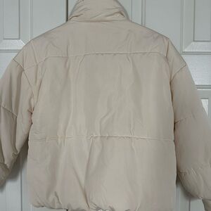 Stylish cream puffer jacket with zip closure and pockets. Perfect for cold weather.