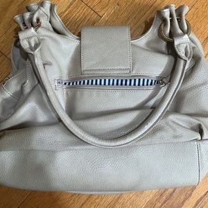 Charming Charlie’s cream purse. Over the shoulder or arm. Gold clasp detailing. Has a zipper to secure items. Very spacious on the inside. Purse exterior is 14” wide and 11” tall.