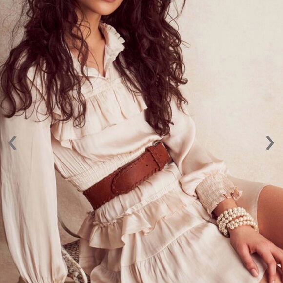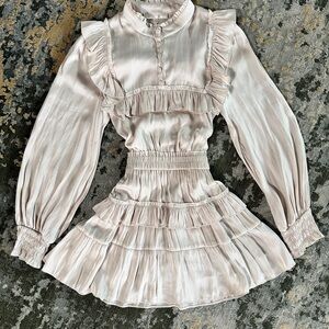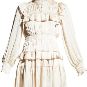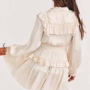 Absolutely stunning LoveShackFancy silk mini dress in a soft, romantic cream shade. Features signature ruffle detailing, smocked cuffs, tiered skirt, and a flattering, feminine silhouette. Effortless, ethereal, and perfect for any special occasion.