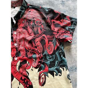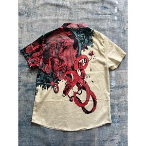 Collared neckline with a v notch and buttons. Cream color with a red Japanese art style octopus on the front and back. Short sleeves. Rounded hemline and textured fabric. Please see closeup photo to see fabric's texture.