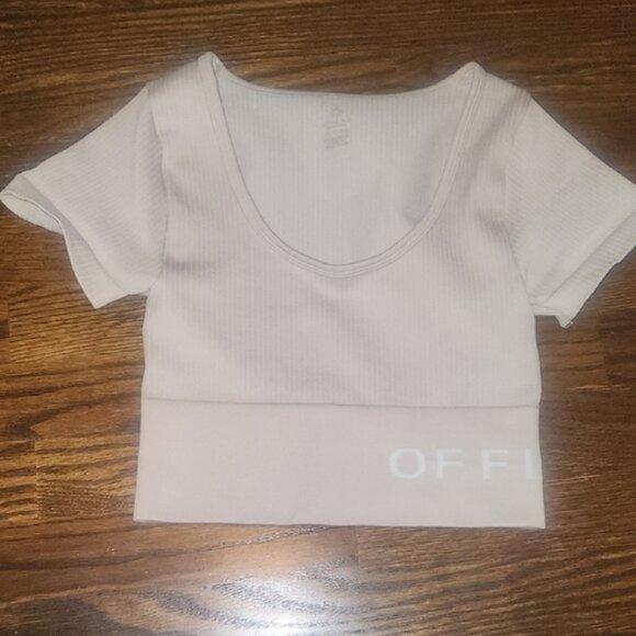 Chic cream bodysuit with ribbed texture. Features a scoop neckline and short sleeves. Ideal for layering or standalone wear.