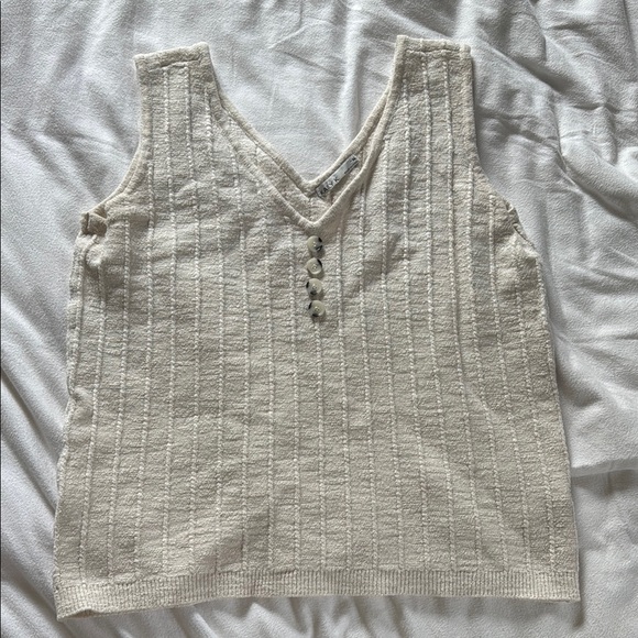 cream tank top with ribbed texture •boxy fit : 18.5” at underarms & 14.5” from pit to bottom. My torso is too short for it! • really soft & a little thicker so great for either layering or wearing solo in the fall.