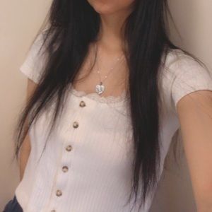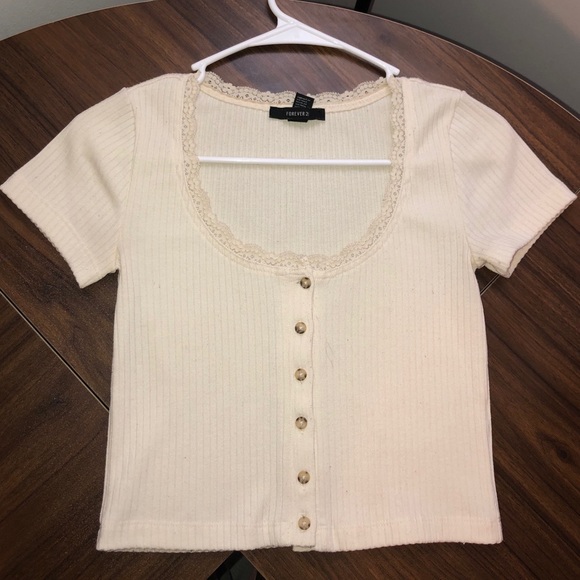 It’s a button up cream colored top. There are two light grey lines by the buttons but it’s not very noticeable.