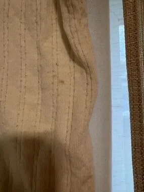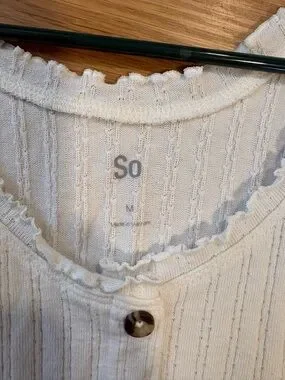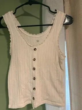 Soft cream ribbed tank with decorative buttons. Sleeveless design with frill-edge trim for a feminine touch. Lightweight knit that layers easily for everyday wear. Cream color adds versatile styling options.