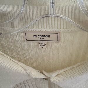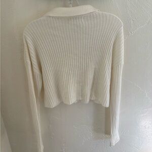 Stylish cream ribbed cardigan with button-up front. Features a classic collar and long sleeves.