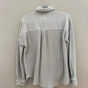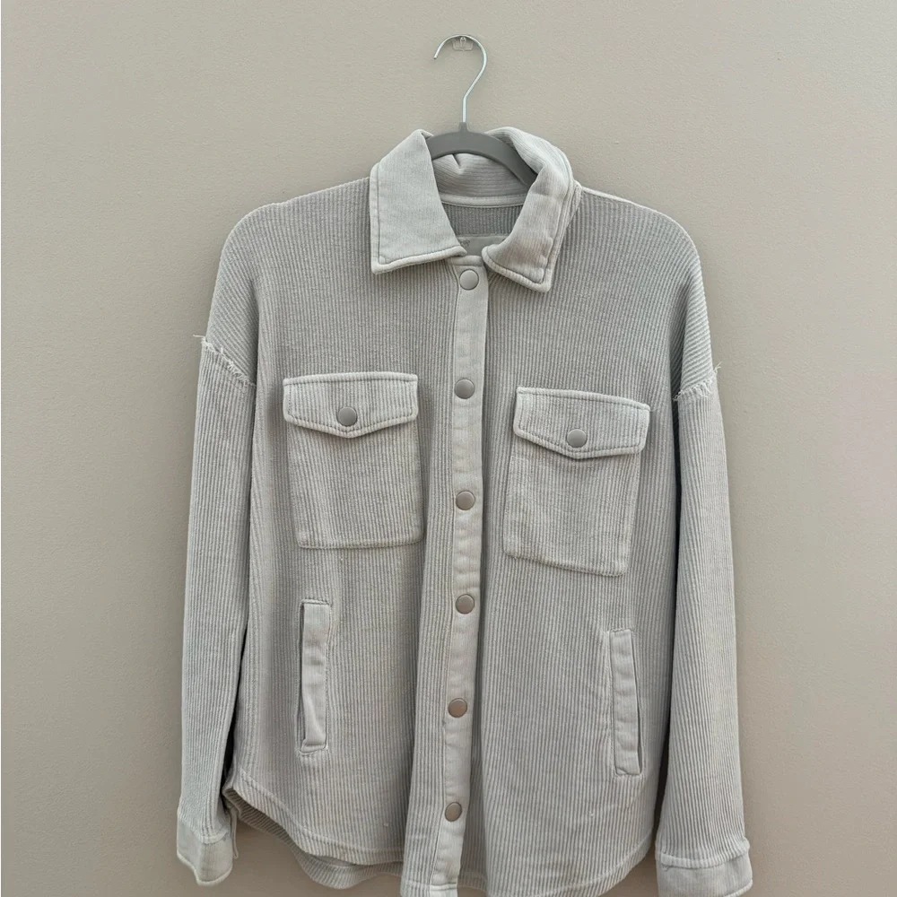 Stylish cream ribbed shacket, oversized with button-up front and pockets. Perfect for layering.