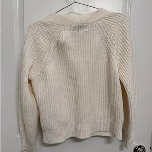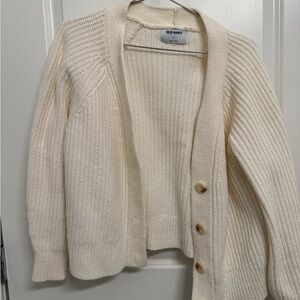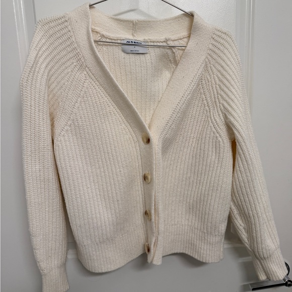 Cream cardigan with ribbed texture. Features button-up front.