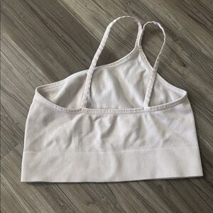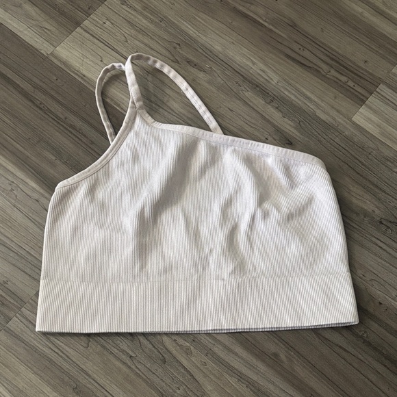 Stylish cream ribbed crop top with spaghetti straps. Perfect for casual wear.