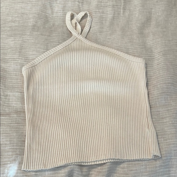 Elevate your style with this chic cream ribbed halter top. Perfect for any occasion, this top offers both comfort and elegance.